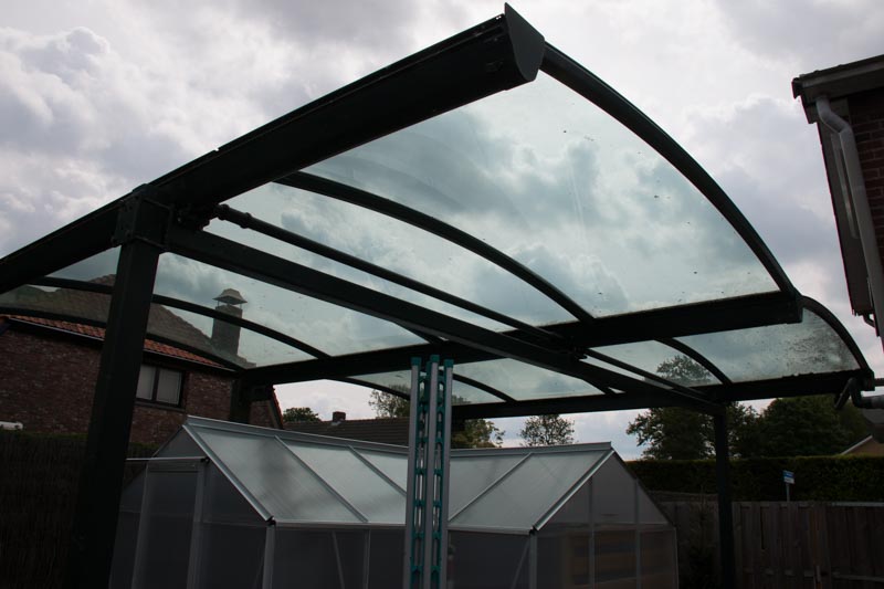 het afbreken van de oude Carport, dit is inmiddels gebeurd en daar hou je spierpijn van over de glas platen die gebogen onder spanning vast zaten met de afmetingen van 1 bij 2 meter (8 stuks) moesten we met zijn tweeën naar beneden zien te krijgen.