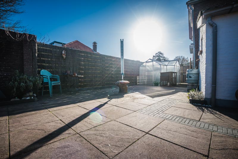 Dit is gelukt met 7 stuks de laatste zat al scheef en knalde uit elkaar met draaien heel veel korrels glas door de tuin net als een ingeslagen autoruit 🙂 het frame volledig van staal was ook een spierballen klus. Maar het is gelukt wat nu rest zijn twee gaten in het terras waar de palen stonden. de balken langs het hek zijn er af en die gaan we hergebruiken voor de fundering van de kas.
