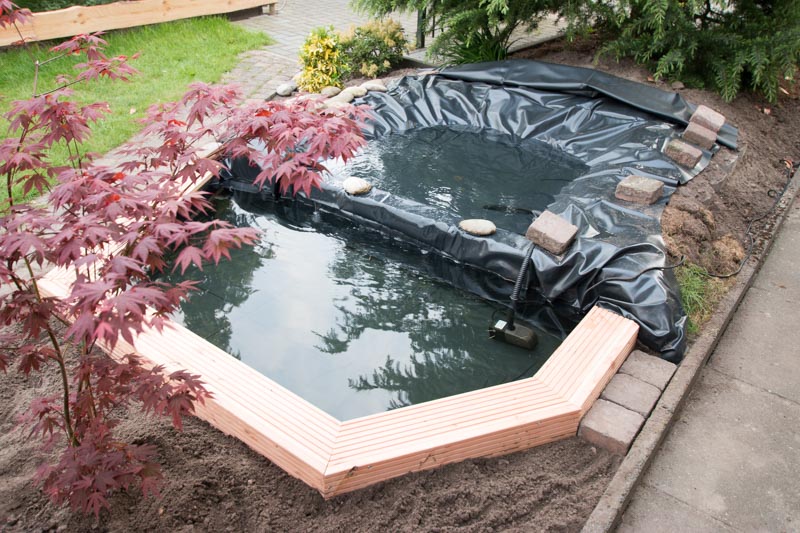 Even een tussentijdse update van de vorderingen, de vijverfolie is geplaatst (dat ging makkelijker dan ik had verwacht) en de eerste test water vulling zit er in om te kijken of alles inderdaad waterpas staat.