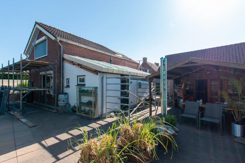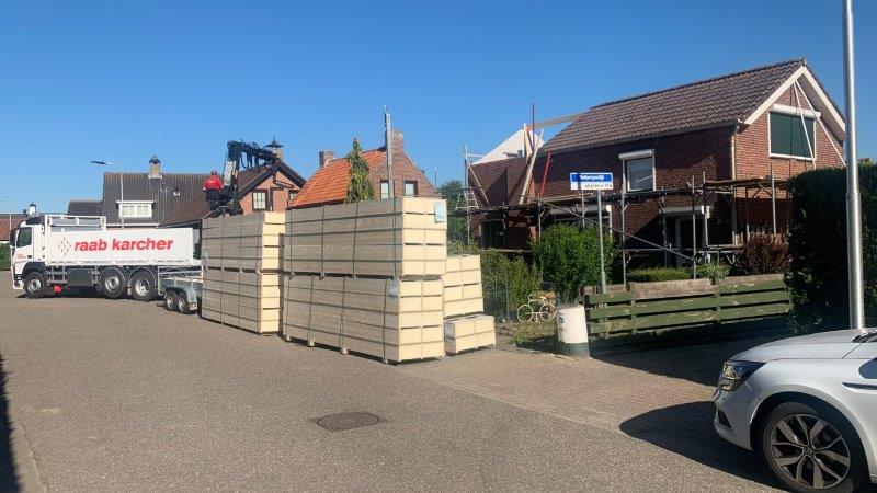 14 juni: Het dak komt eraan! heel vroeg in de ochtend werd er veel geleverd dakplaten en andere spullen ook een container voor de oude dakpannen. Er is op de aanbouw begonnen (ik denk om te oefenen) het was 28 graden en felle zon af en toe was het niet uit te houden op dat dak volgens mij..